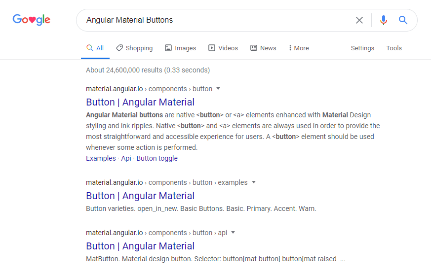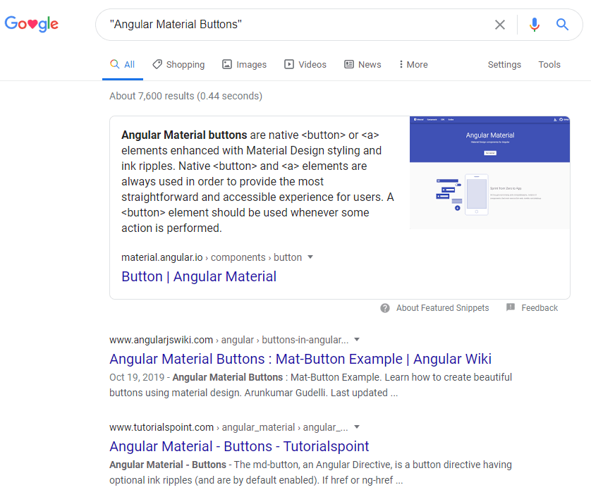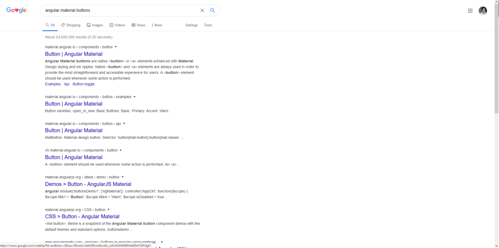 If you’re trying to search for front end elements, such as Angular, you want to search for “Angular Material Buttons”, cause if you just do Angular Material Buttons you will get a less refined search. They will still be pretty similar, but it helps narrow it down in some cases:
